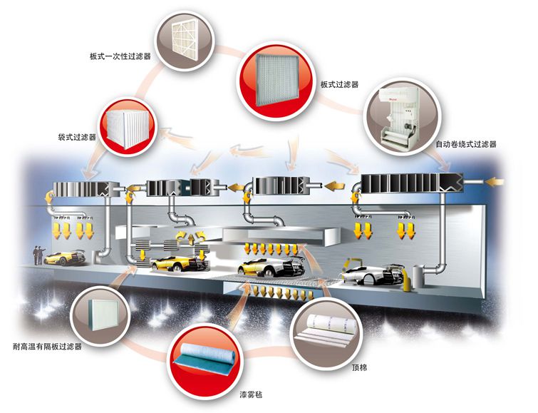 针对汽车涂装行业,提供耐高温有隔板过滤器,高容尘量的初、中效袋式过滤器,天井滤棉,漆雾毡,耐高温过滤棉,自动卷绕式过滤器等产品。其不含硅酮,阻燃点符合德国工业标准DIN 53438 FI,耐高温等特性完全能够满足涂装行业的特殊要求。 在汽车涂装行业拥有丰富的现场经验及服务能力,能满足不同客户的需求。