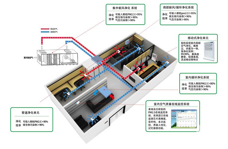 PM2.5室内空气解决方案主要针对商用及民用建筑,涵盖颗粒物、微生物污染物、气态污染物的控制。从现场勘察测量、模拟数据、定制方案、制作样板间、专业施工、售后服务等几个方面,强调交钥匙工程,确保客户能享受到最好的产品、最好的设计和服务。遵循节能环保理念,设计出将物理吸附与静电过滤技术相结合的创新产品,并且多项发明专利,产品系列齐全,满足各种空调系统及空气净化的定制需求,为专业的系统方案解决及维护供应商。